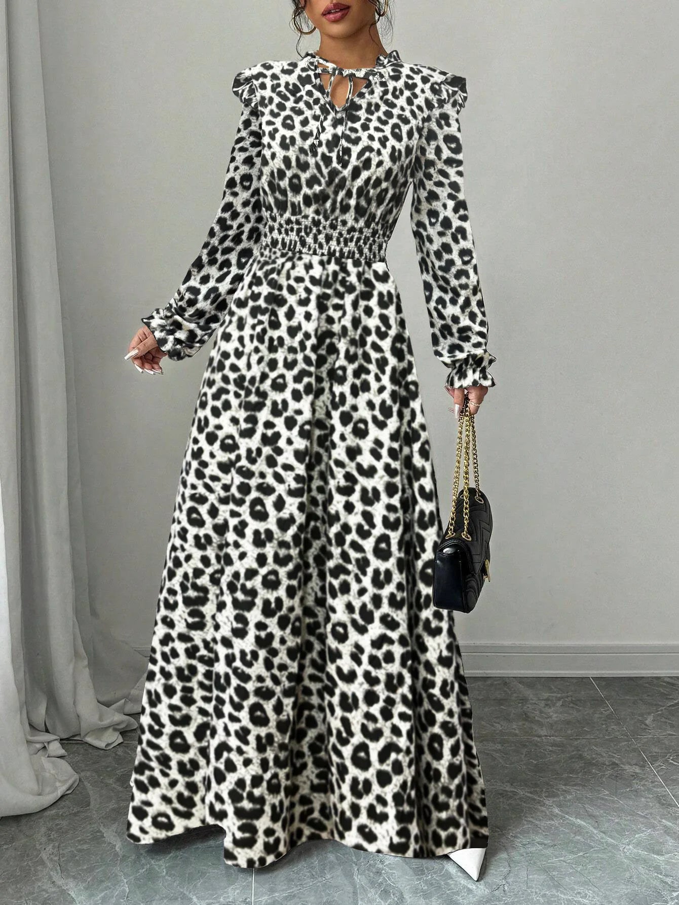 Robe longue noire à fleurs en polyester pour femme, ample et fluide, avec manches longues et lien à nouer au cou pour un style élégant sans décolleté