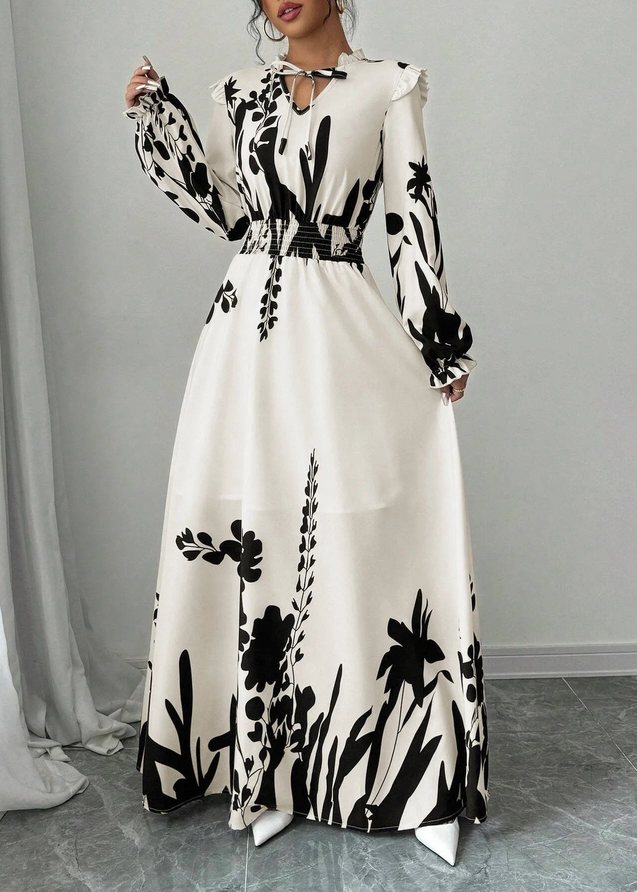 Découvrez la robe longue fluide noire à fleurs avec manches longues et col à nouer, parfaite pour un look féminin, moderne et raffiné