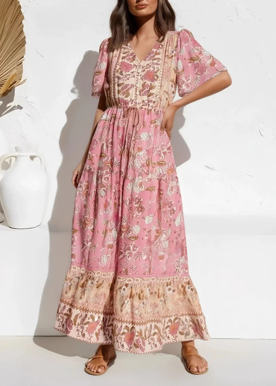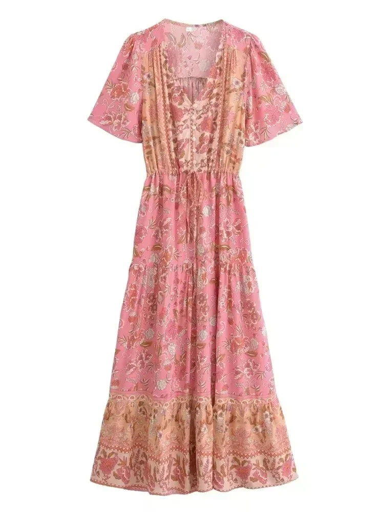 Robe longue femme rose à fleurs style bohème vintage chic avec manches courtes et lacets, offrant confort et allure féminine raffinée pour le printemps