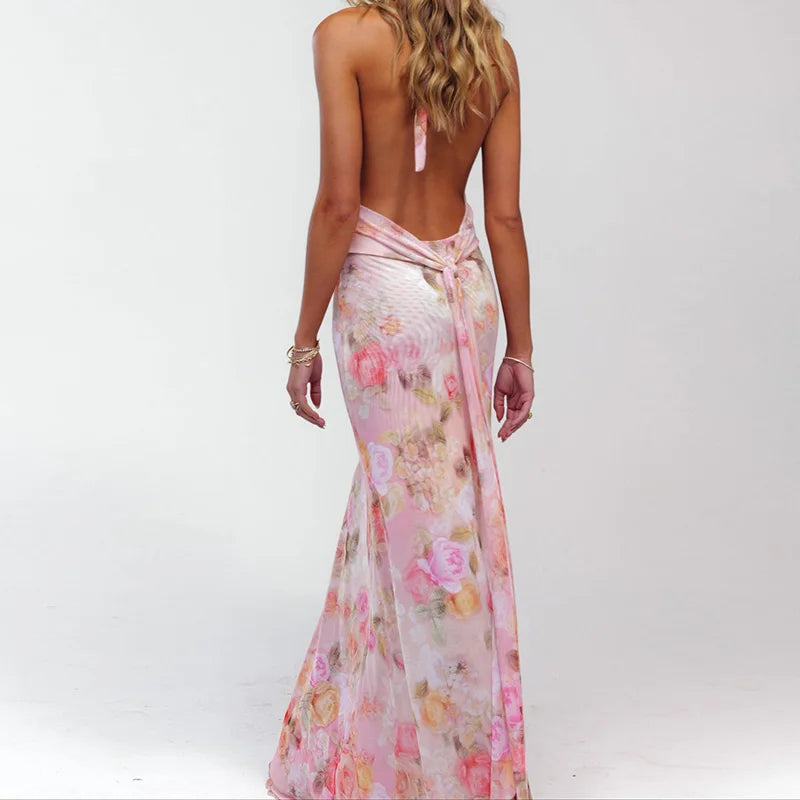 Son décolleté plongeant apporte une touche de sensualité maîtrisée, tandis que le dos nu révèle délicatement vos épaules pour un look romantique et sophistiqué. L’imprimé floral rose souligne la féminité naturelle de cette robe longue, qui allie confort et élégance.