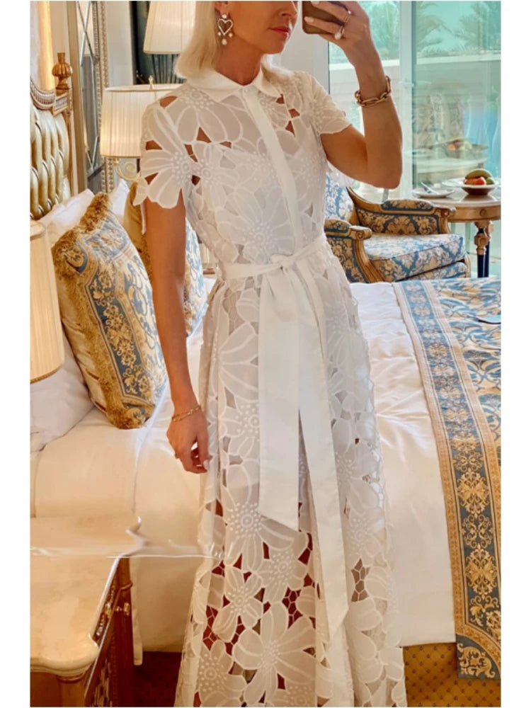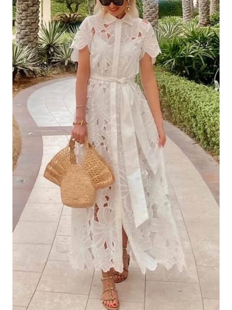 Robe longue blanche brodée avec ceinture ajustable et manches courtes, un choix élégant pour les femmes modernes et sophistiquées