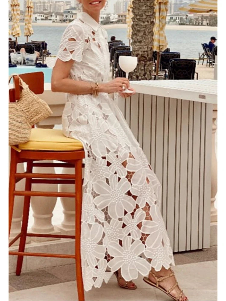Découvrez la robe blanche longue à manches courtes avec broderies délicates et ceinture ajustable, parfaite pour une allure élégante et intemporelle
