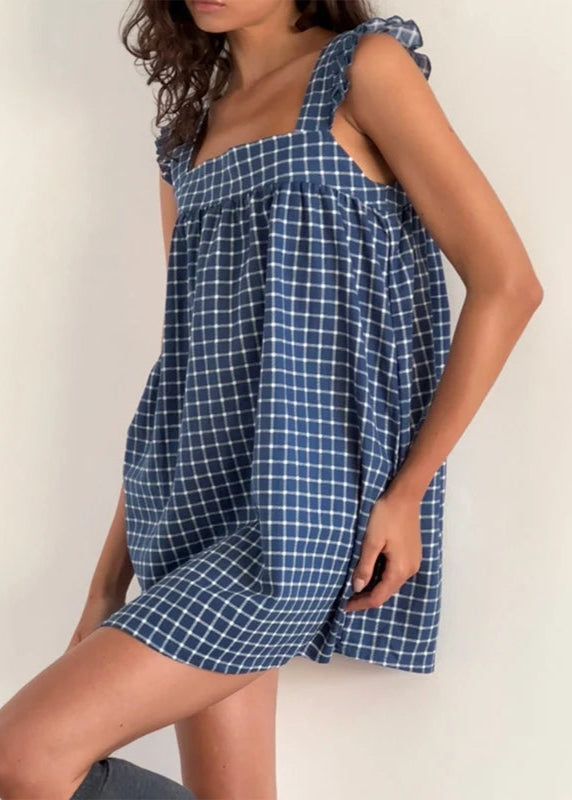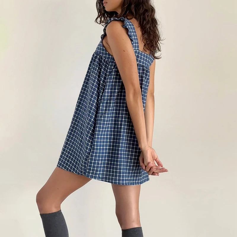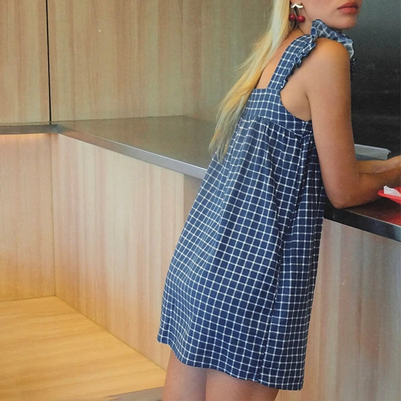 Holen Sie sich einen Retro-Look mit diesem kurzen Vintage-Kleid für Damen im trendigen Y2K-Cottage -Stil. Dieses leichte und fließende Kleid mit dünnen Trägern und quadratischem Ausschnitt wird durch sein marineblaues Karomuster aufgewertet – perfekt für den Sommer.