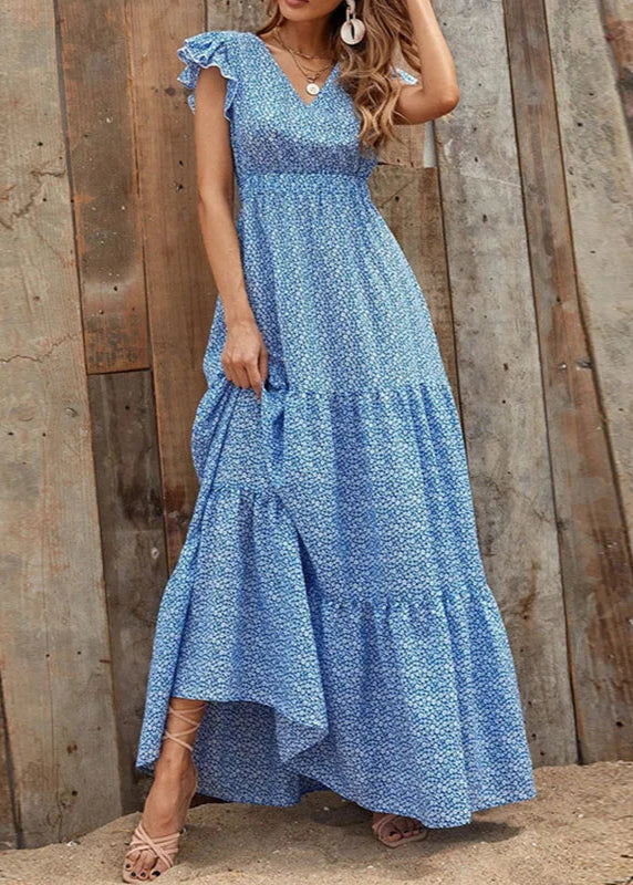 Die hohe Taille lässt die Silhouette schlank wirken, während die Knöchellänge für einen Hauch von Eleganz sorgt. Der V-Ausschnitt betont das Dekolleté, ohne zu viel zu zeigen – für einen Look, der sowohl schick als auch dezent wirkt. Der lockere Schnitt ist perfekt für Frauen, die ein bequemes und dennoch feminines Kleid suchen.