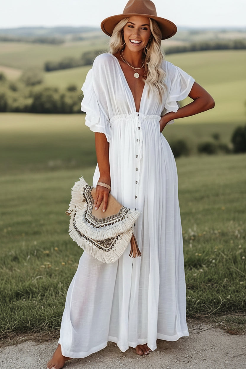 The fine buttons that adorn it give it an unparalleled look, you will be in the long white hippie dress one of the trendiest women and will leave a mark wherever you go. The loose short sleeves are decorated with light ruffles you will feel like you're on a little cloud in this evening dress.