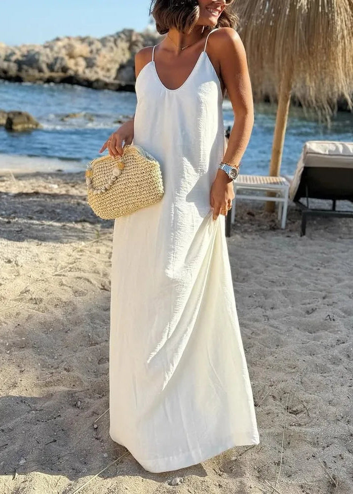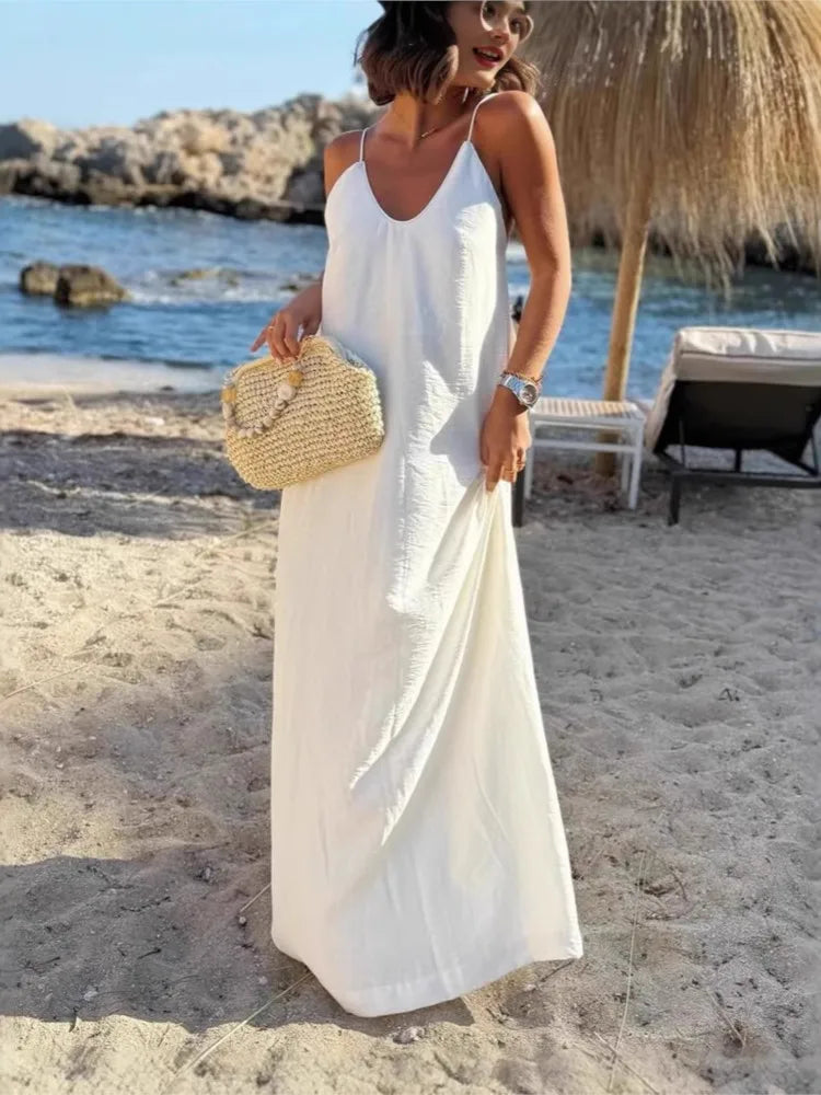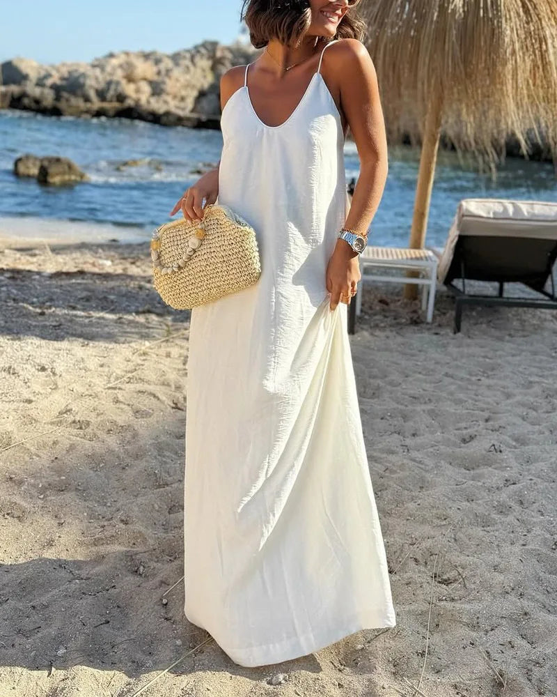 Découvrez la robe longue à bretelles et dos nu d’été pour femme au style bohème chic idéale pour vos journées ensoleillées et vos vacances