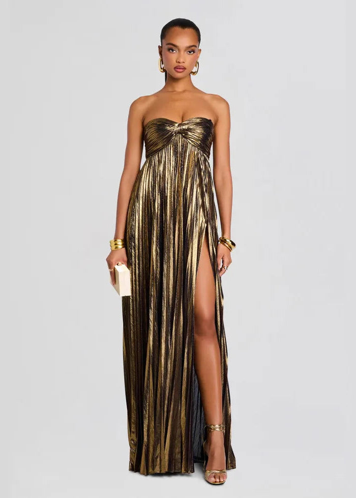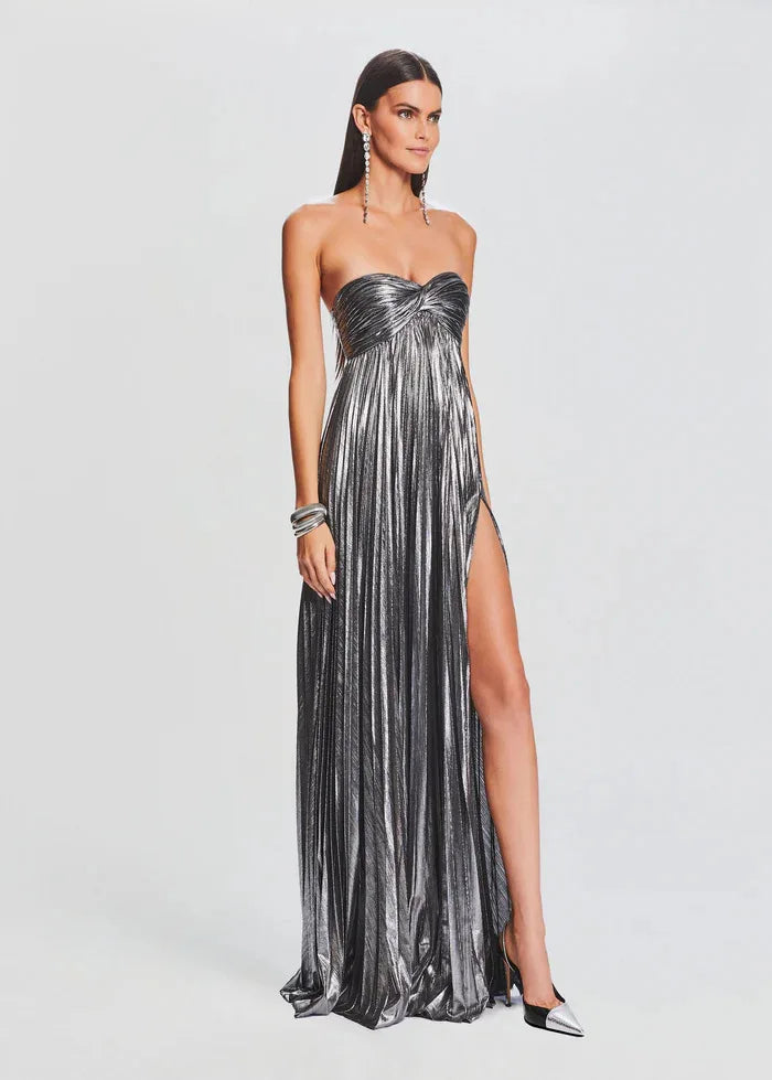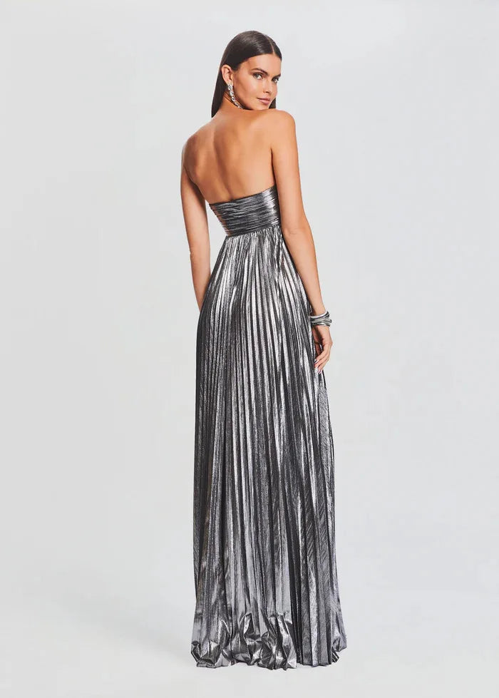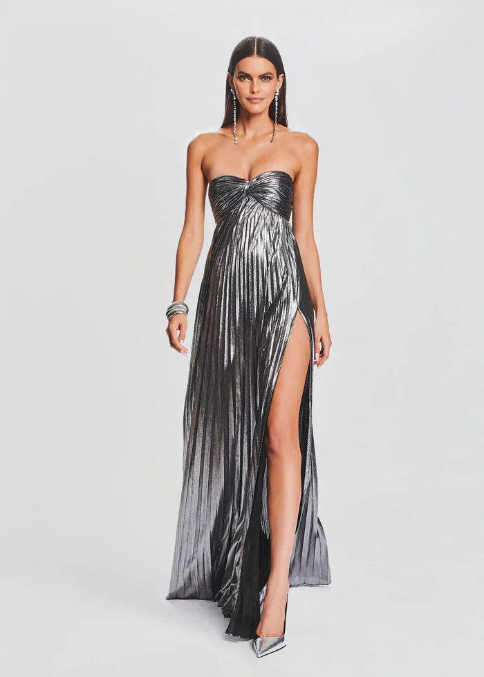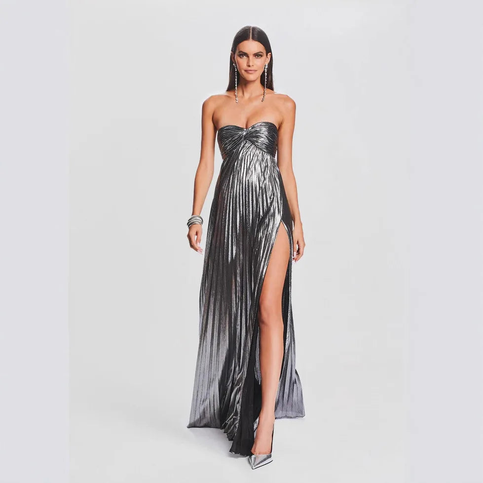 Choisissez une robe bustier satinée brillante aux reflets gris et argent pour un style sophistiqué et harmonieux lors des événements estivaux