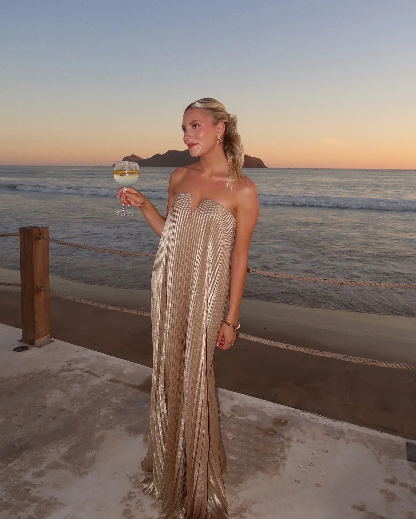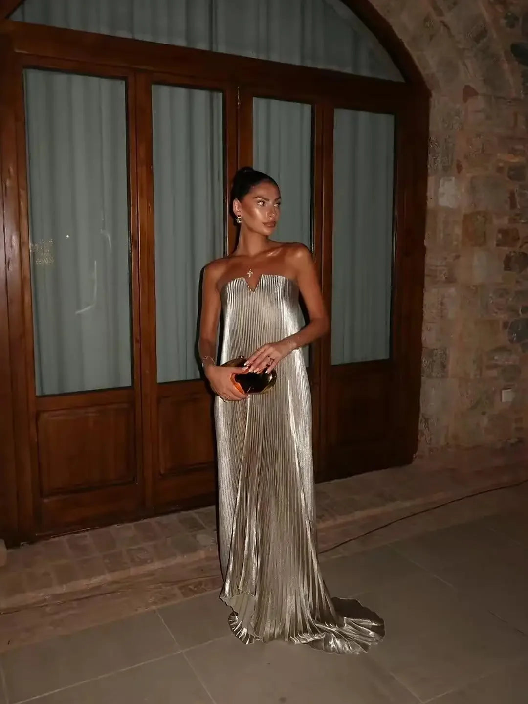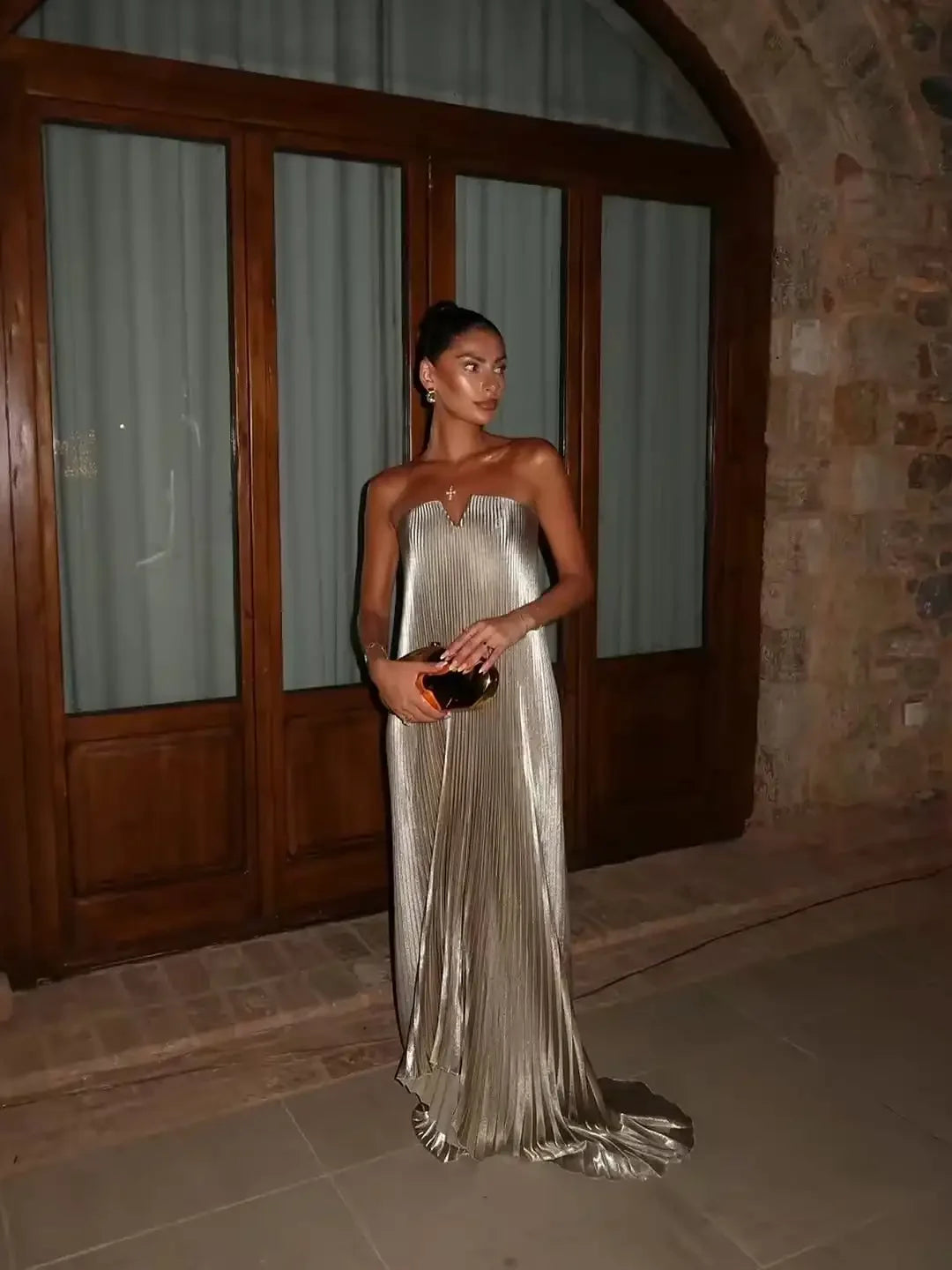 Découvrez la robe bustier dorée plissée et dos nu pour femme idéale pour un mariage, une soirée ou un événement chic en été