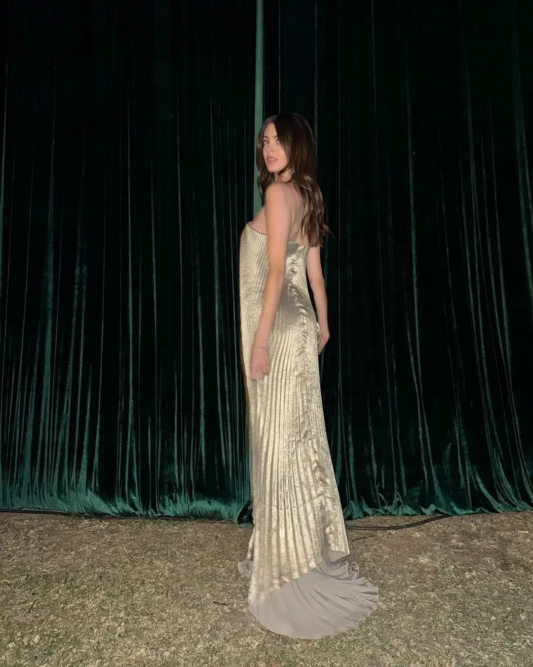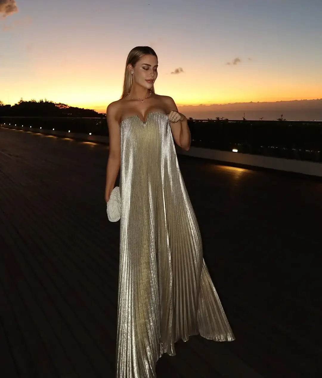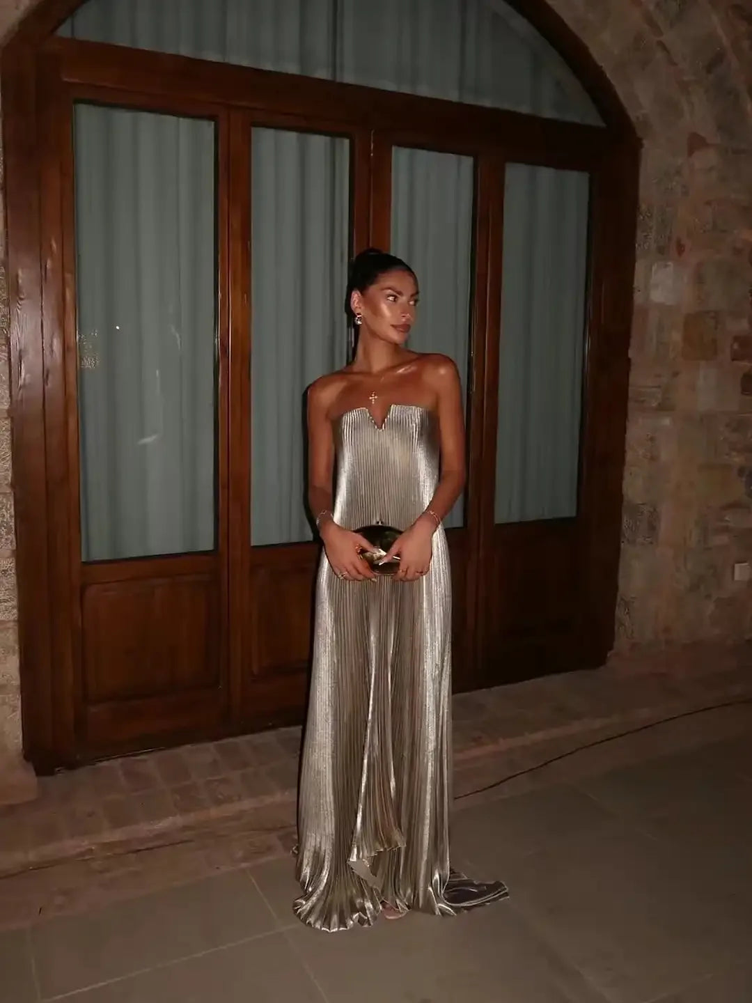 Découvrez la robe bustier dorée plissée et dos nu pour femme idéale pour un mariage, une soirée ou un événement chic en été