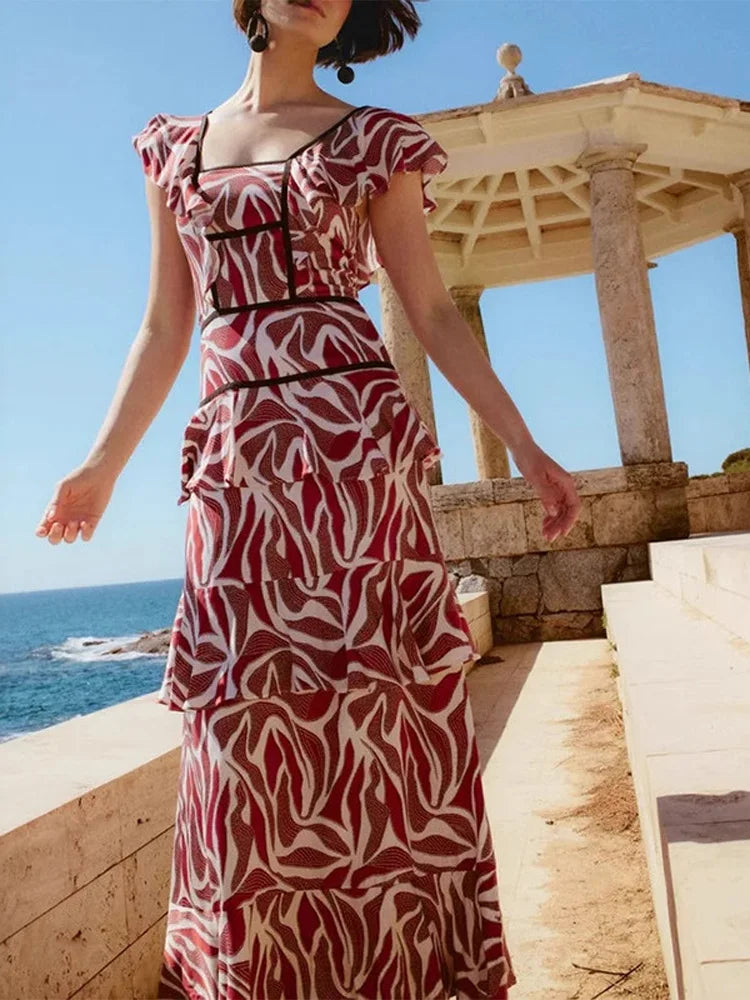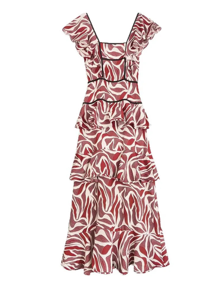 Elegant Long Dress with Square Neckline and Ruffles in Chic Style