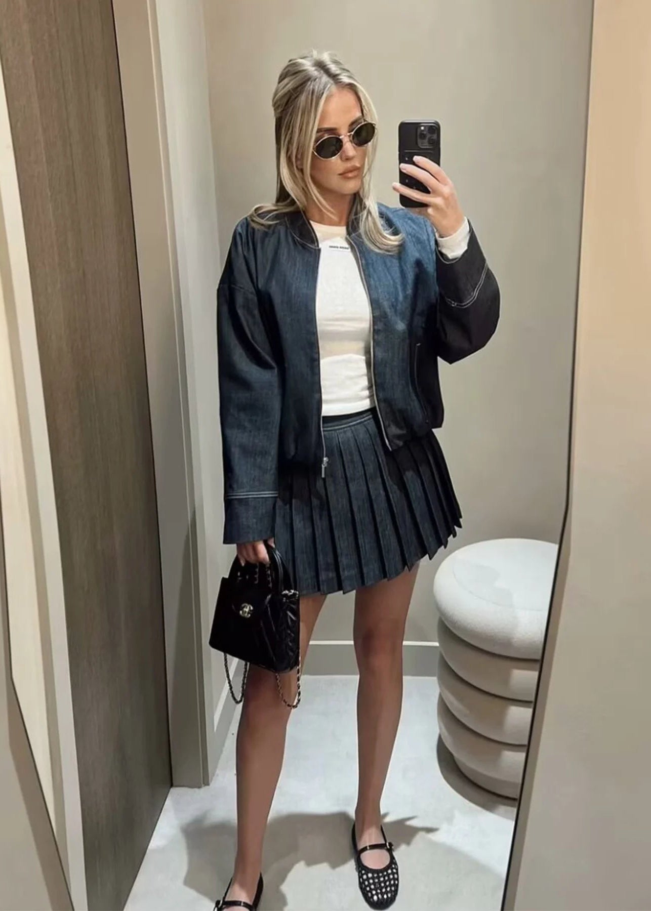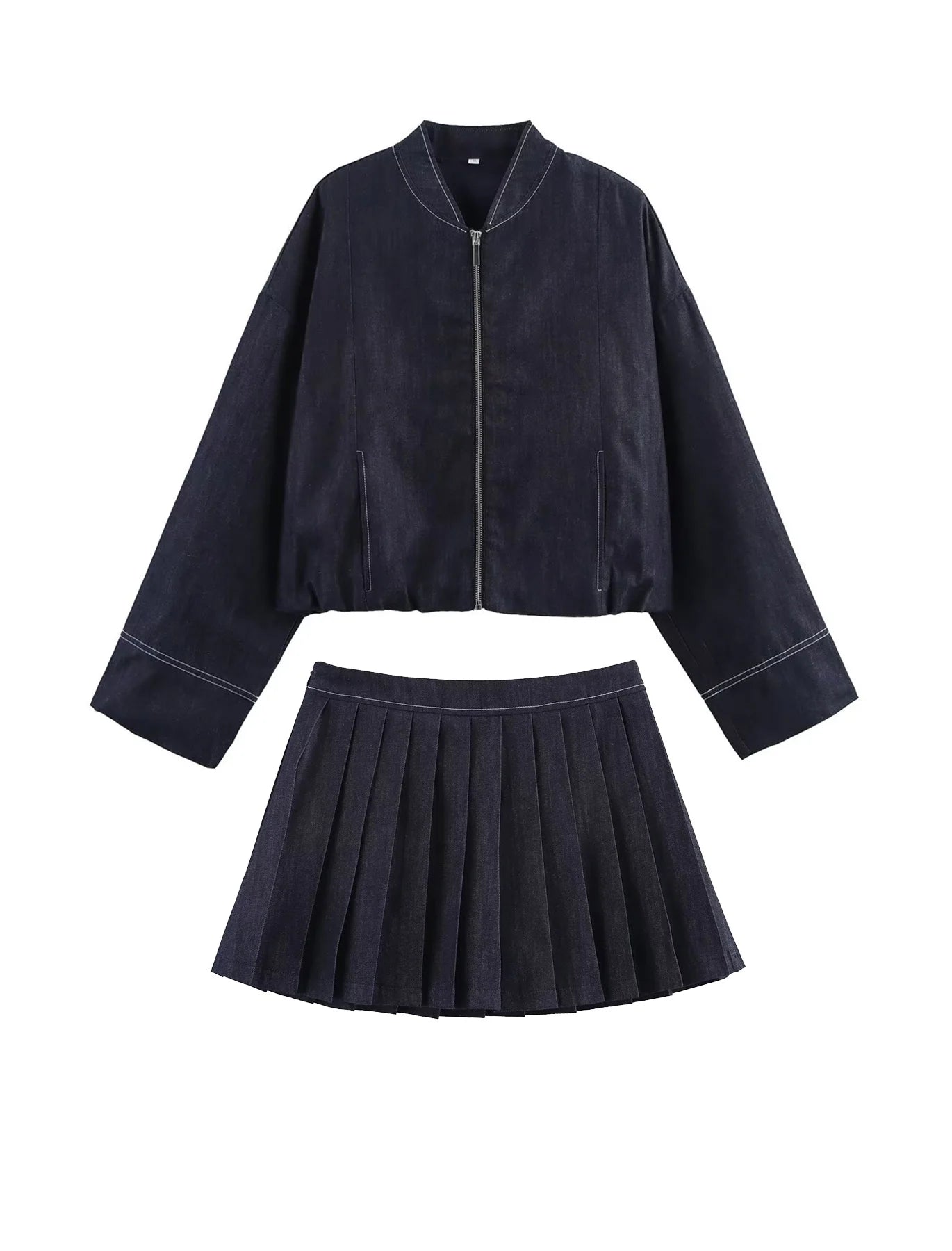 Discover the new must-have women's 2-piece set of the 2025 season. This set consisting of a pleated mini skirt and a bomber-style denim jacket combines elegance and boldness in a design that is both modern and timeless. Perfect for women who want to express their style with confidence, this look is designed for those who closely follow chic urban fashion.