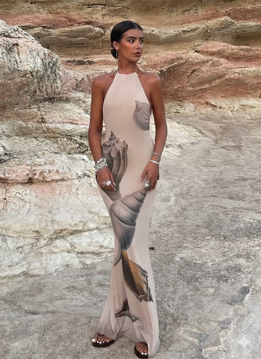 Robe beige col halter chic au style bohème et raffiné avec une coupe flatteuse pour vos événements