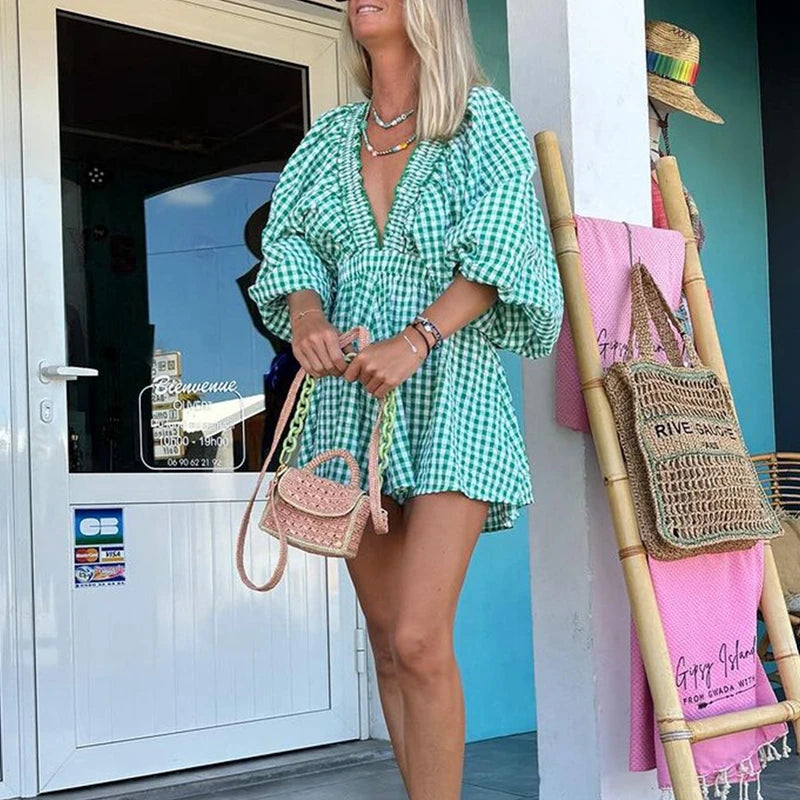 Apportez une touche rétro et fraîche à votre dressing estival avec cette robe bohème chic pour femme, au motif vichy à carreaux verts. Son design vintage, sa coupe fluide et son col en V élégant en font une pièce parfaite pour un look cute et mignon, idéal pour la plage ou les sorties décontractées.