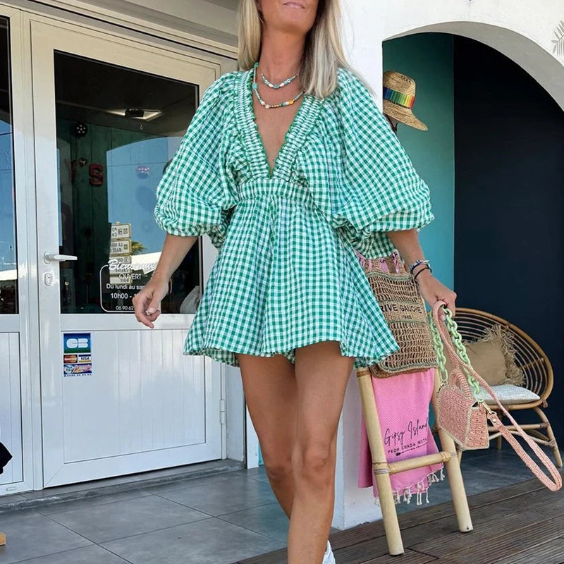 Robe Bohème Chic à Motif Vichy Vert – Style Vintage et Décontracté
