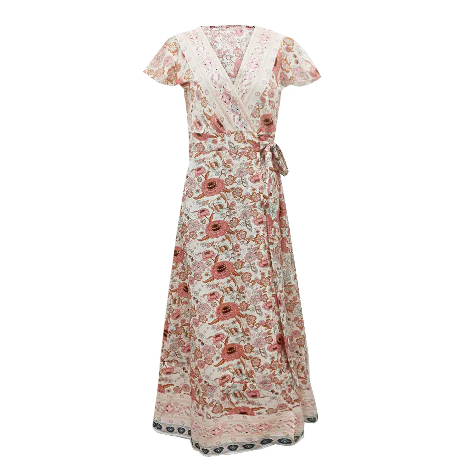 Dale un toque de frescura y feminidad a tu armario con este vestido bohemio largo rosa. Su estampado floral, corte cruzado y cinturón anudado realzarán tu figura con gracia. Perfecto para días soleados, festivales o una noche de verano, encarna el estilo bohemio en todo su esplendor.