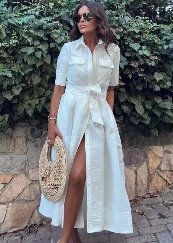 Robe chemisier longue pour femme avec ceinture et col à revers, parfaite pour un style élégant, fluide et tendance au quotidien