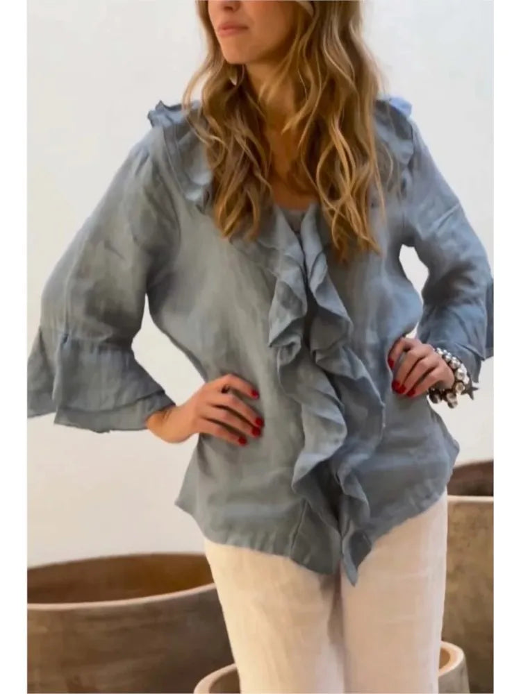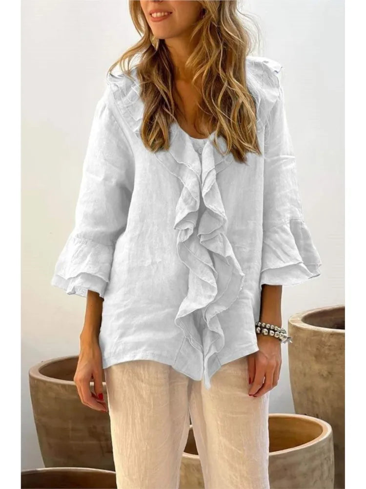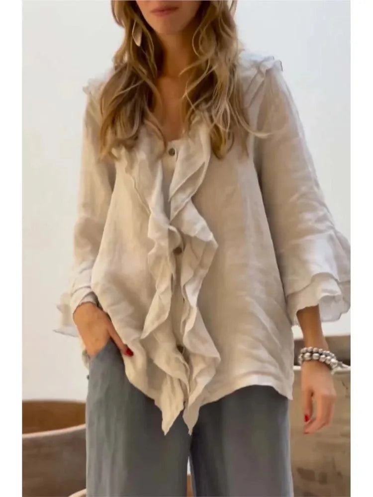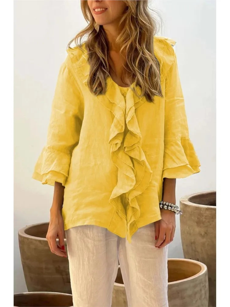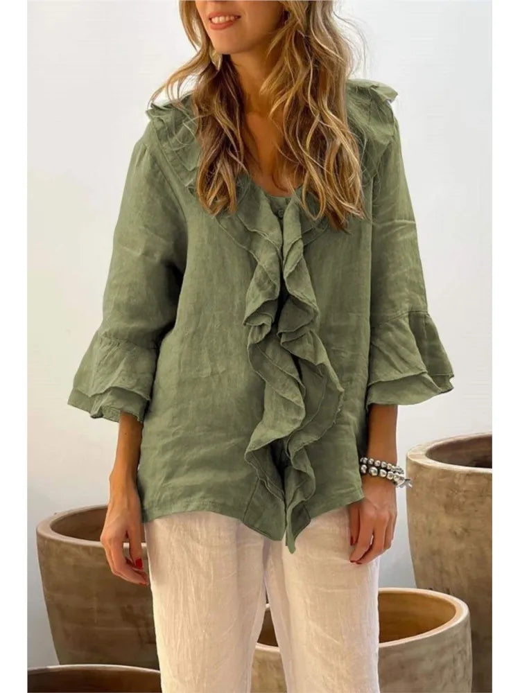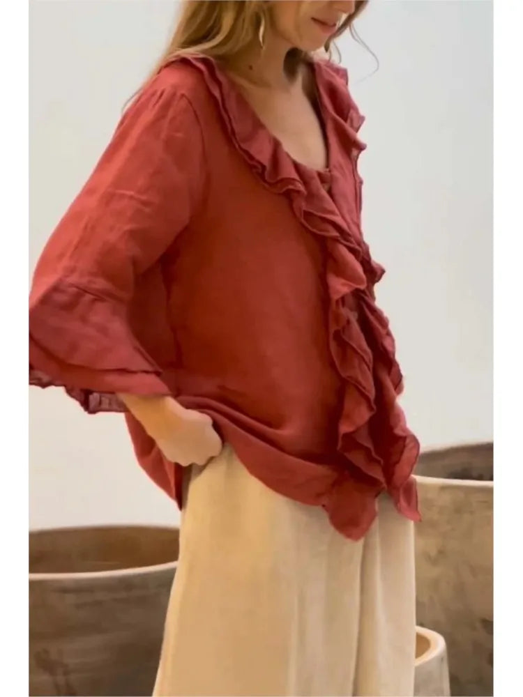 Casual Vintage Solid Ruffle Shirts Top Women Spring Autumn Elegant V Neck Button Office Top 3/4 Flying Sleeve Loose Blouses 2024