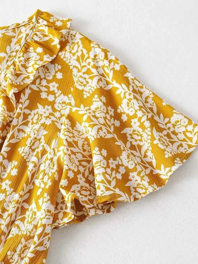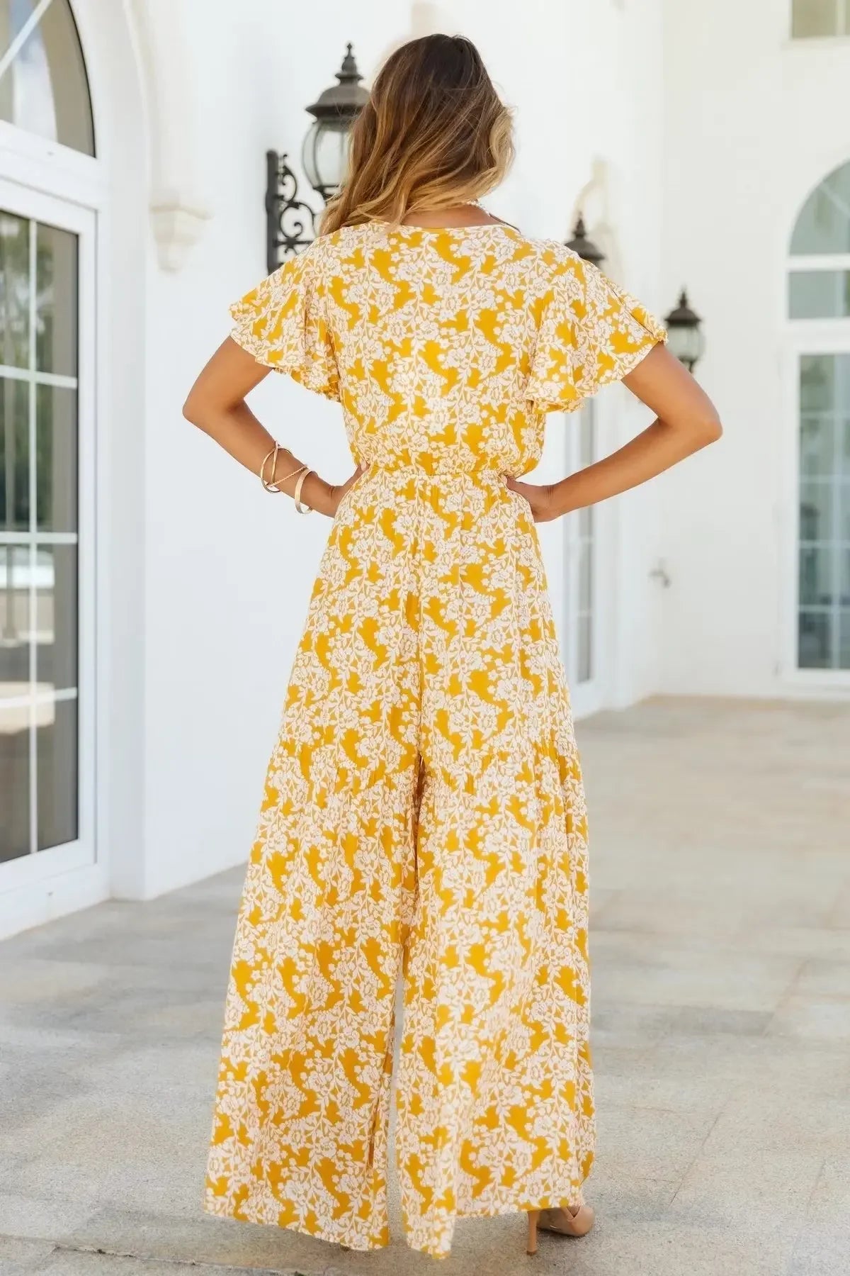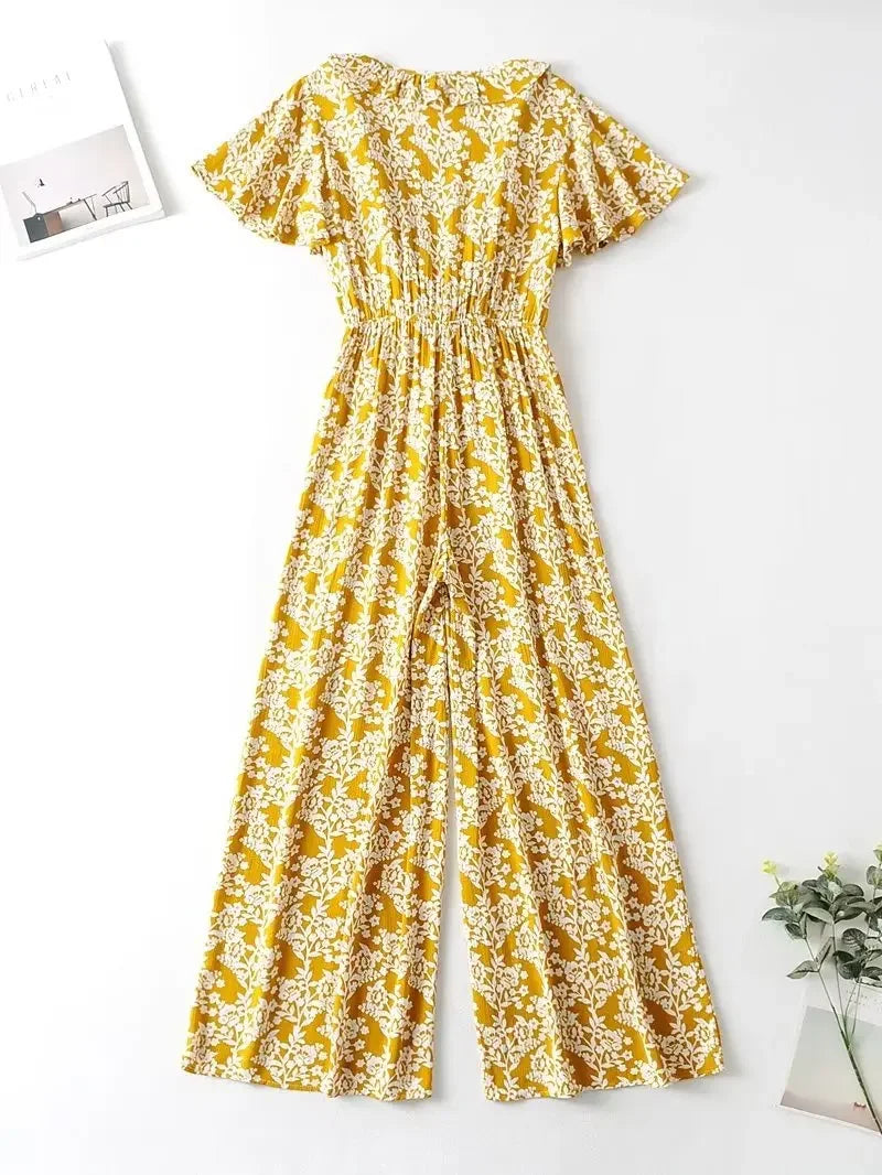Cette combinaison bohème incarne l'élégance décontractée avec une touche vintage. Son imprimé floral sur un mélange de coton et rayonne évoque la douceur des journées d'été. Le col V plongeant ajoute une note sexy et féminine, tandis que les manches courtes et la coupe fluide à jambes larges garantissent une liberté de mouvement et un confort optimal, idéal pour la plage ou les balades. La ceinture à nouer à la taille permet de structurer la silhouette et de mettre en valeur vos courbes.