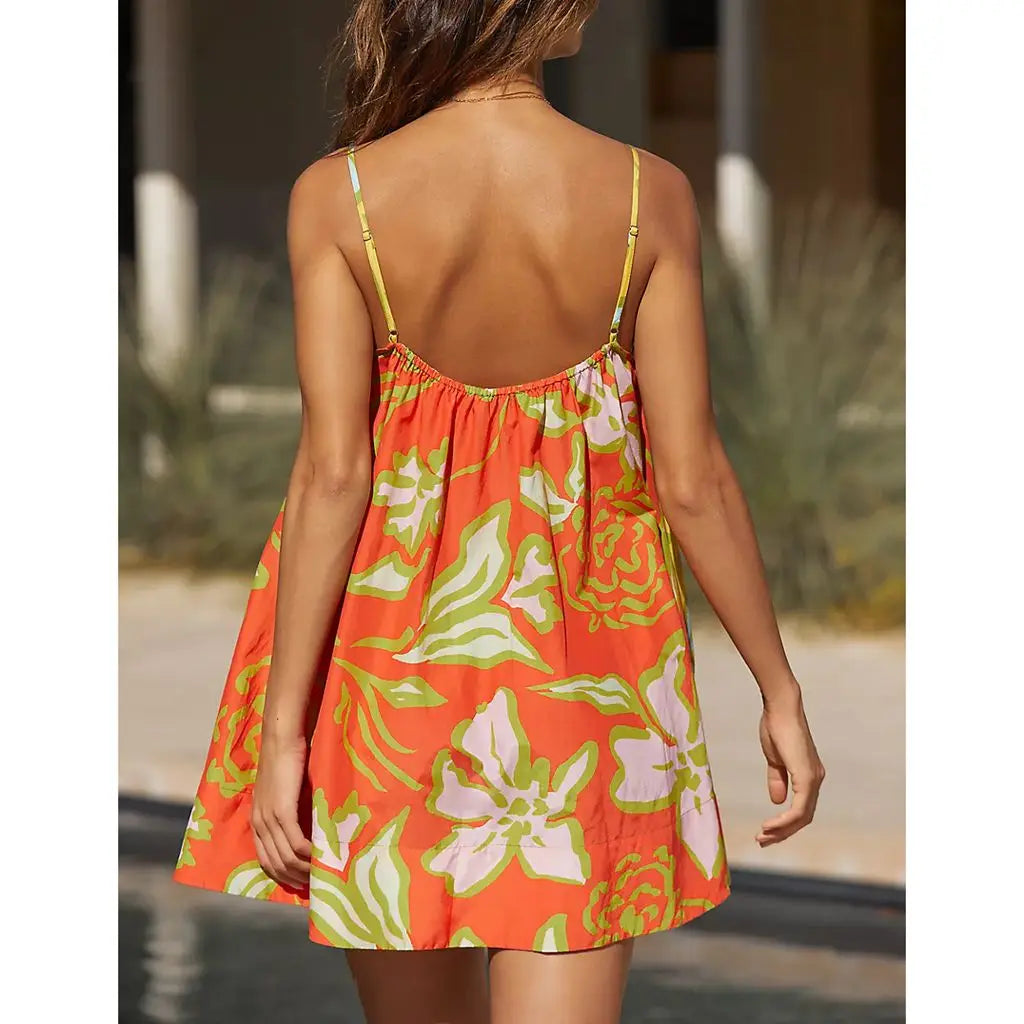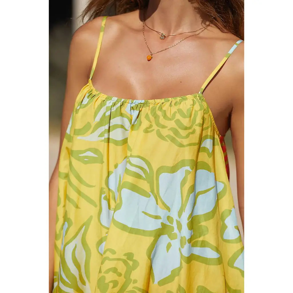 Conçue pour un maximum de confort par temps chaud, elle adopte une coupe ample A-line, une longueur mini au-dessus du genou, et des bretelles spaghetti réglables qui s’ajustent parfaitement à votre silhouette.
