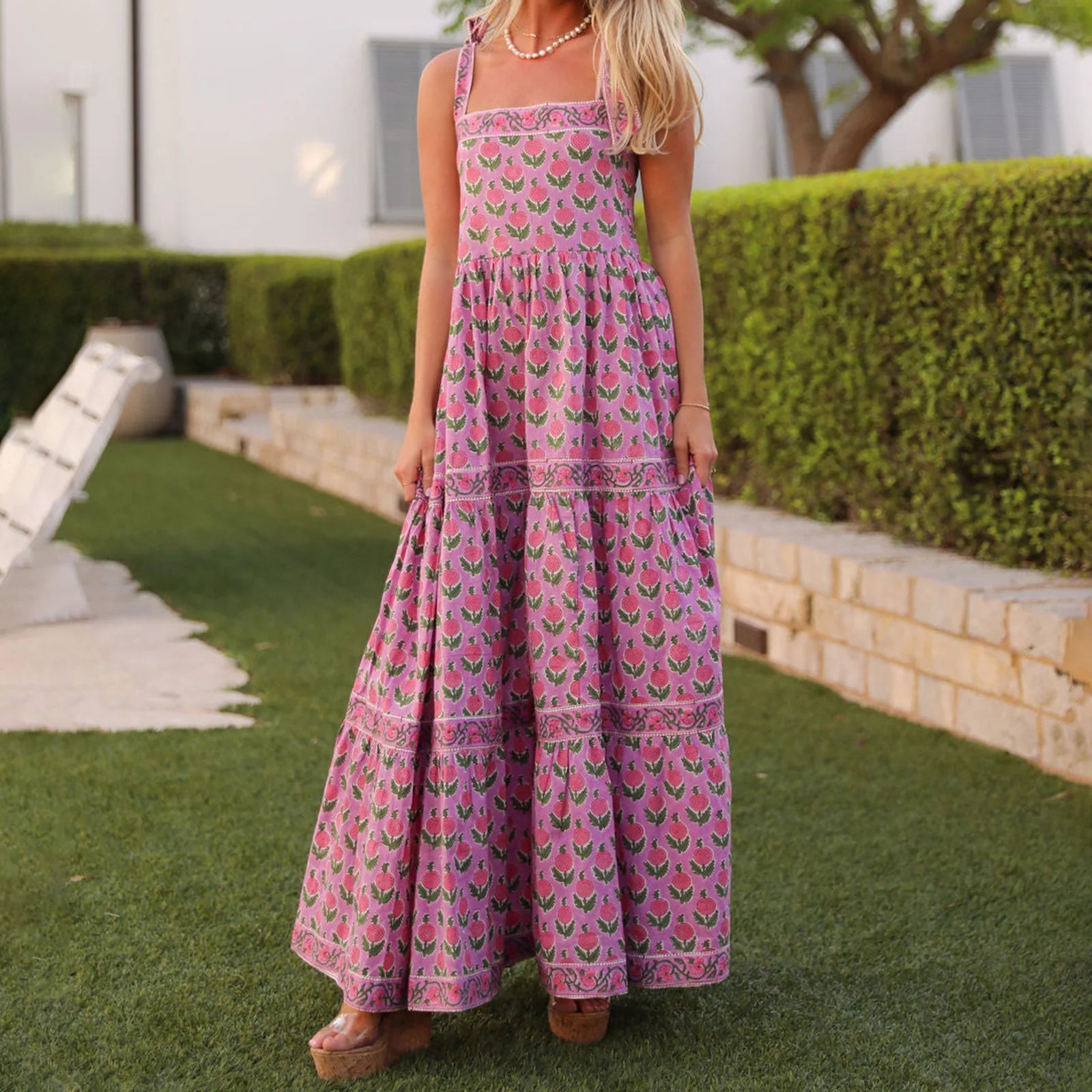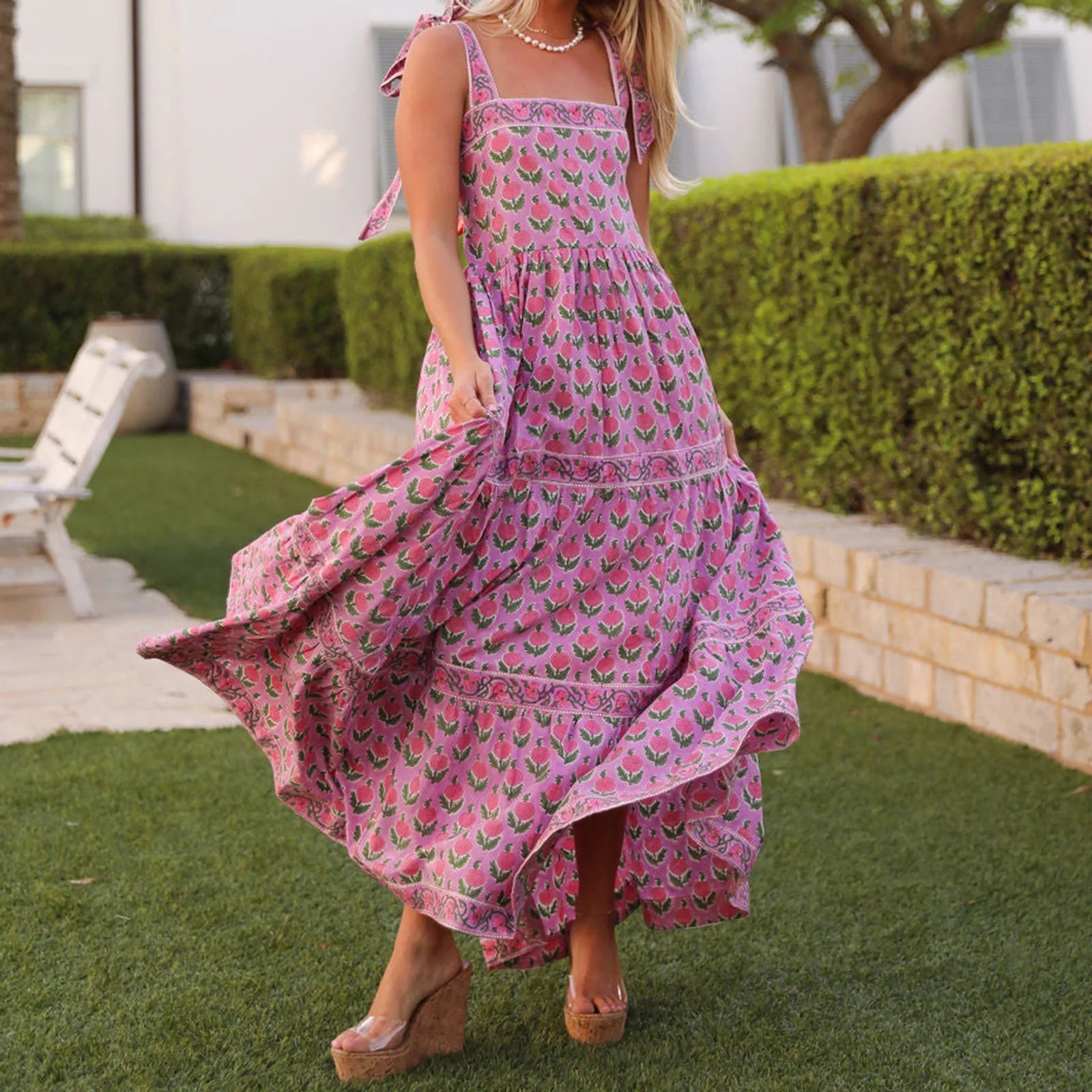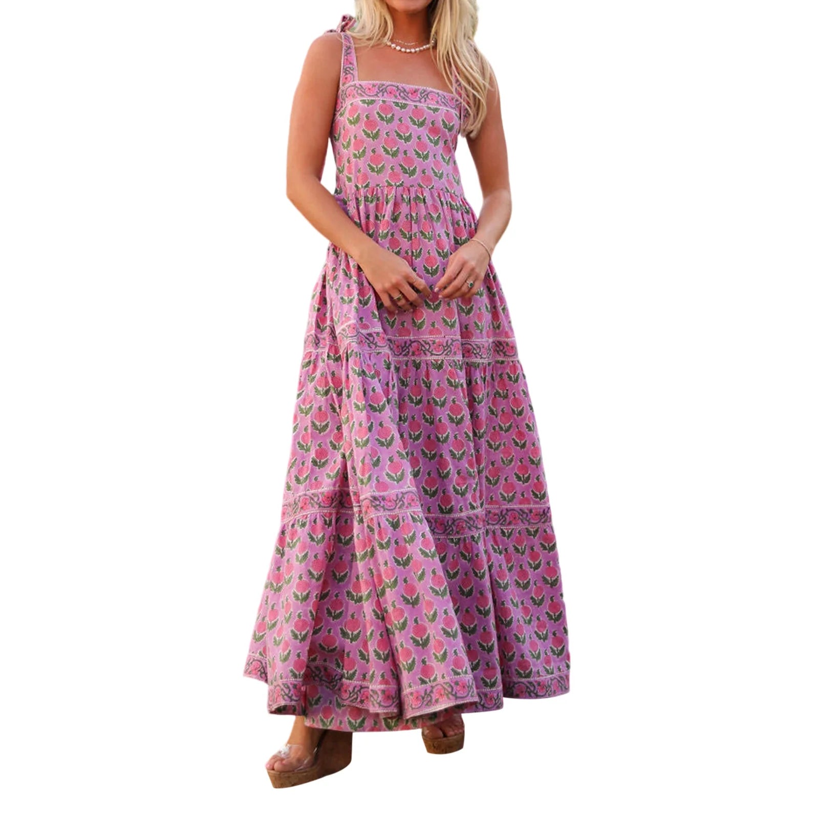 Women's Summer Long Cami Dress Purple Sleeveless Flower Print Spaghetti Strap Summer Holiday Swing Dresses